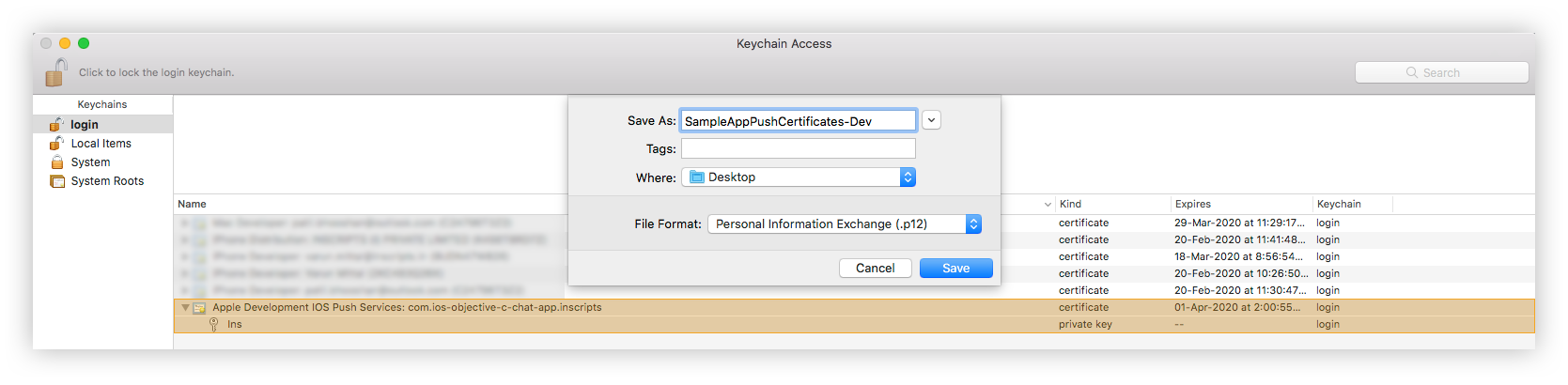 - Type a name for the .p12 file and save it to your Mac.
