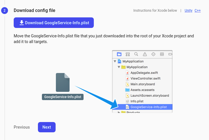 - Download the GoogleService-Info.plist file and place it in the mentioned location of your project. Move your config file into the root of your Xcode project. If prompted, select to add the config file to all targets as follows.