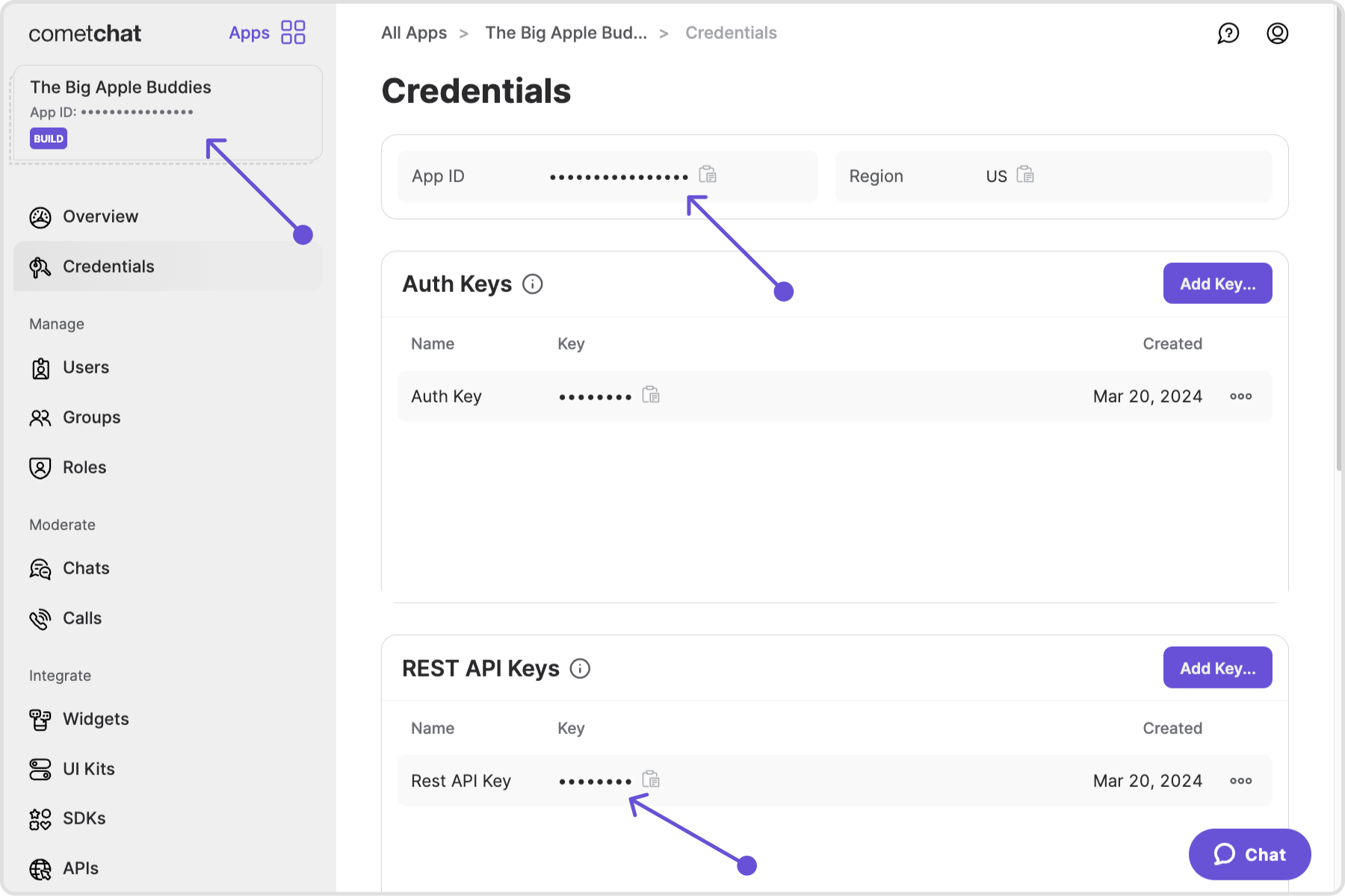 To get started with CometChat’s REST API, you’ll need to obtain your AppID, API key & region by signing up for an account on CometChat’s dashboard. Once you have those details, you can start integrating CometChat’s features into your application.