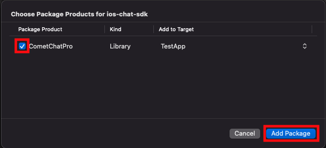 1. CometChatPro must be checked in the Package Product column and click on Add Package. This will add Package Dependencies menu in Xcode.