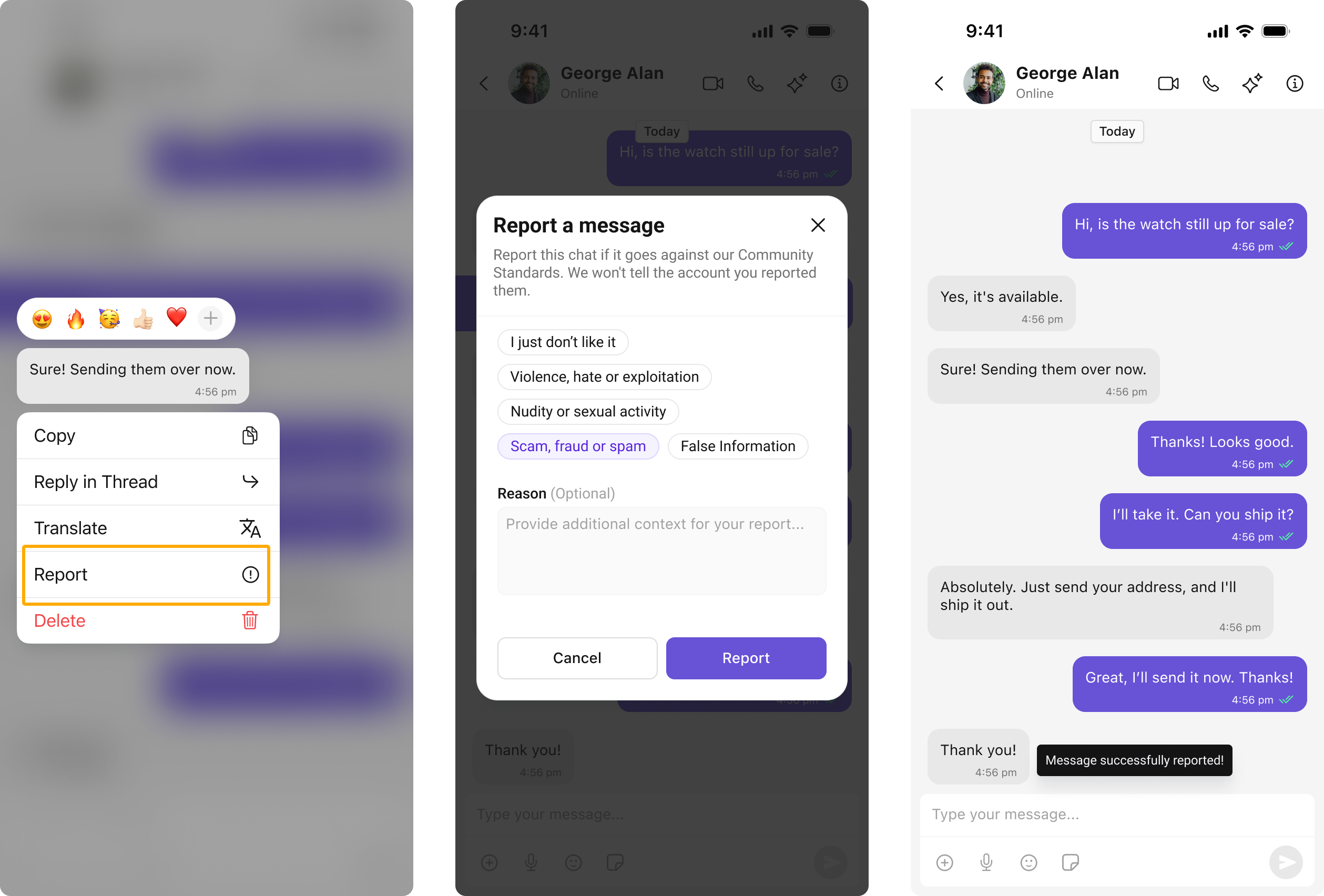 | Message List | Message List provides the “Report Message” option in the message actions menu, allowing users to initiate the reporting process for inappropriate messages. |